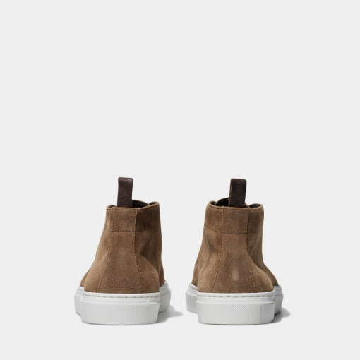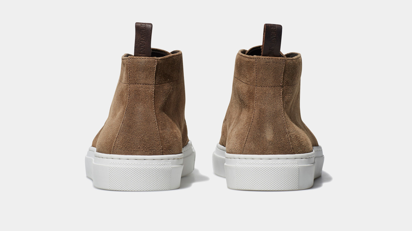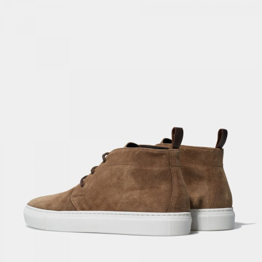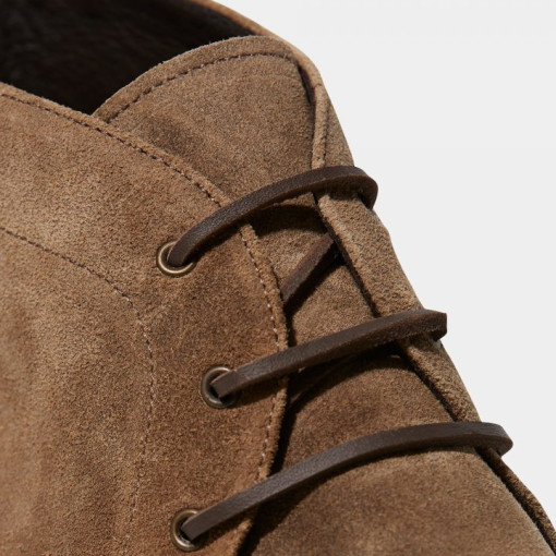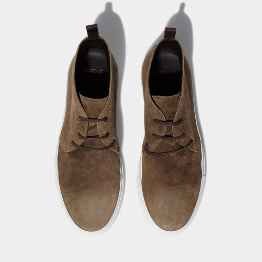 Sneaker ankle boot model with three holes, ankle height, in soft tundra suede calfskin. White rubber sole, box sole made in Italy. Leather loop on the heel with Ottaviani label, leather lace.