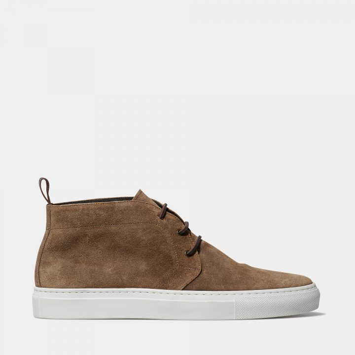 Sneaker ankle boot model with three holes, ankle height, in soft maracca suede calfskin. White rubber sole, box sole made in Italy. Leather loop on the heel with Ottaviani label, leather lace.