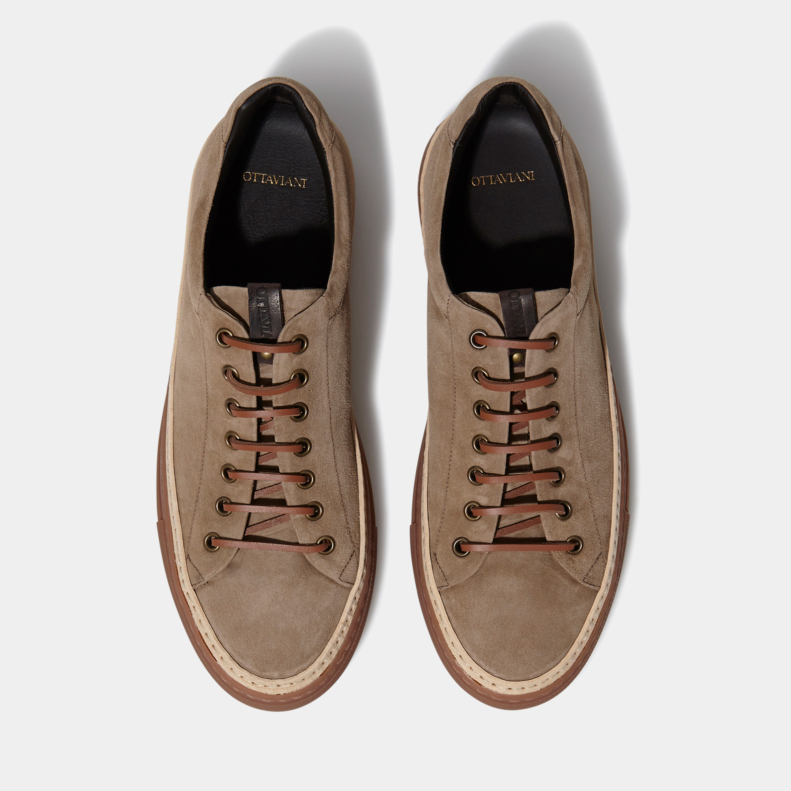 Sneaker in soft sand suede calfskin, amber rubber sole made in Italy, with natural leather welt in profile. Label with Ottaviani bolt on the tongue, leather lace and, inside, cotton spare lace.