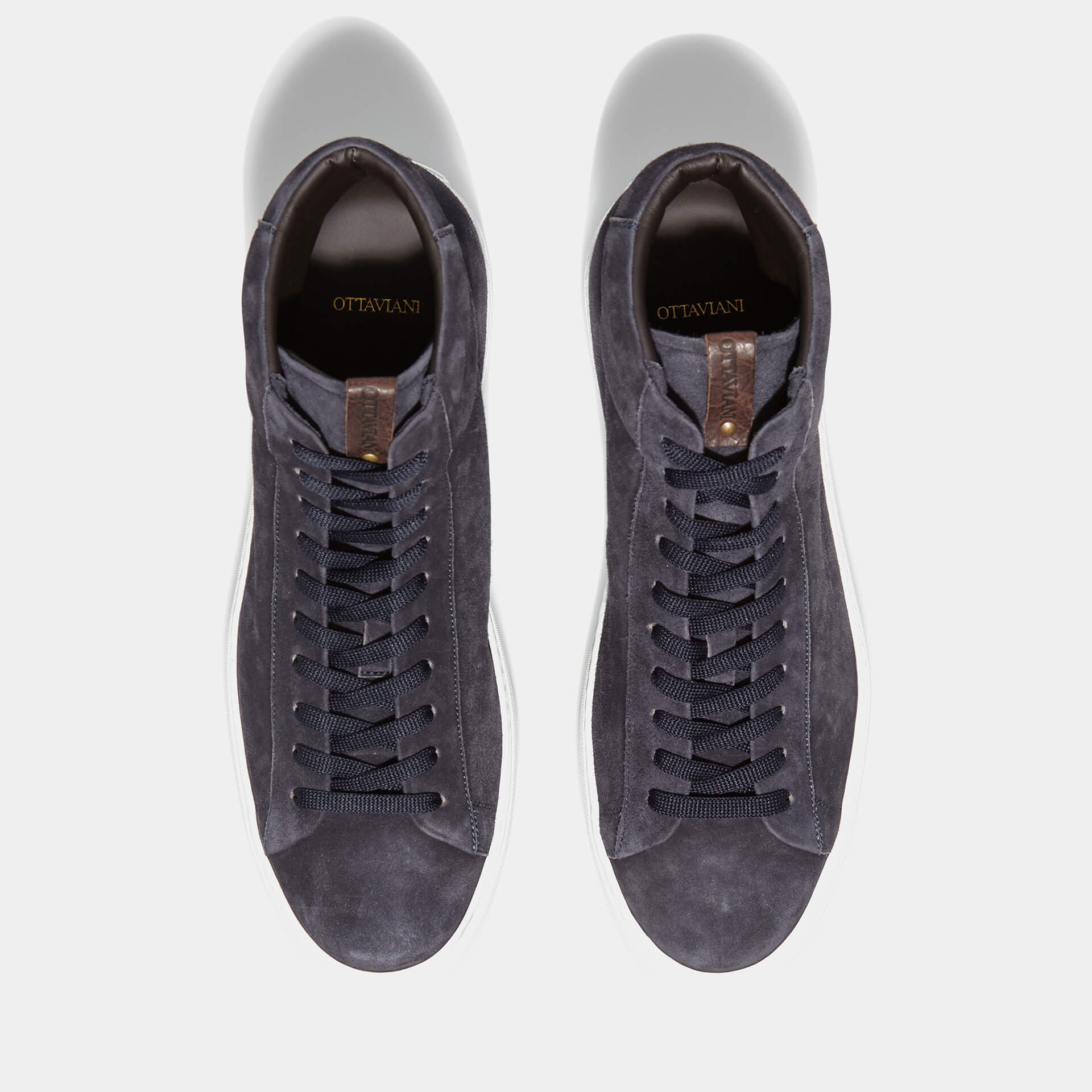Sneaker alta modello COBY in pelle scamosciata colore blu, suola in gomma superleggera bianca made in Italy. Etichetta con bullone Ottaviani sulla linguetta e stampa su toppone, laccio in cotone blu e all’interno della confezione laccio di ricambio.
