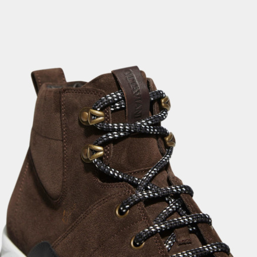 Sneaker alta in pelle scamosciata colore bruno. Suola running leggera vibram con battistrada roccia in gomma made in Italy. Etichetta in pelle con bullone Ottaviani sulla linguetta. Altezza fino alla caviglia imbottita per un maggiore comfort .Logo OT2008 laterale stampato a caldo.
